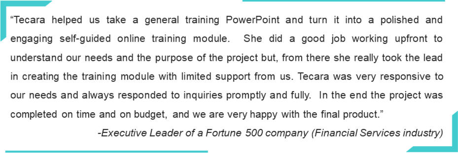 We are passionate, driven, creative professionals with a proven record of developing engaging, interactive, user-centered learning solutions. We specialize in e-learning and instructional design, with a vast array of experience in curriculum development and e-learning course creation using Articulate Storyline 360.
